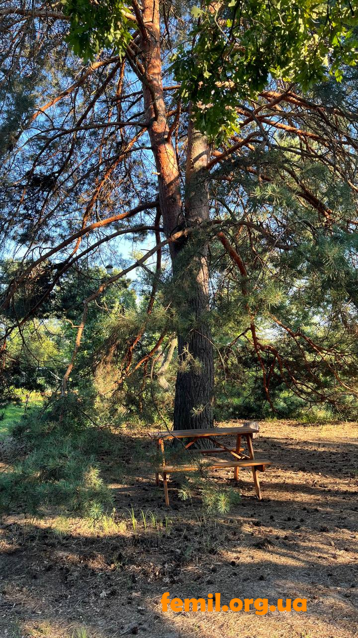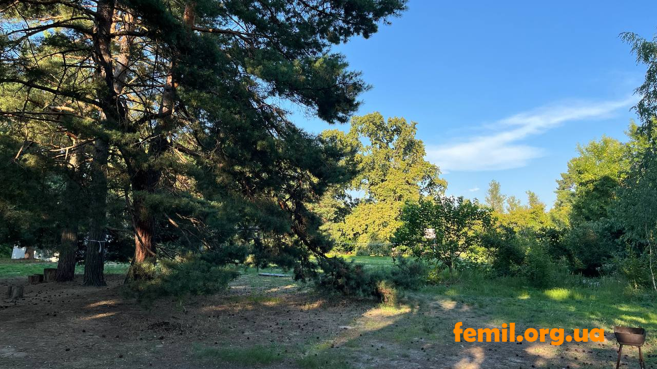 На території багато затінку: шикарні дуби, ялини, сосни. Загалом, наче в ідеальному лісі: широкі галявини попід розлогим гіллям, тут можна було б знімати якесь фентезі про гобітів або ж просто готувати на грилі і насолоджуватися легким флером походу.