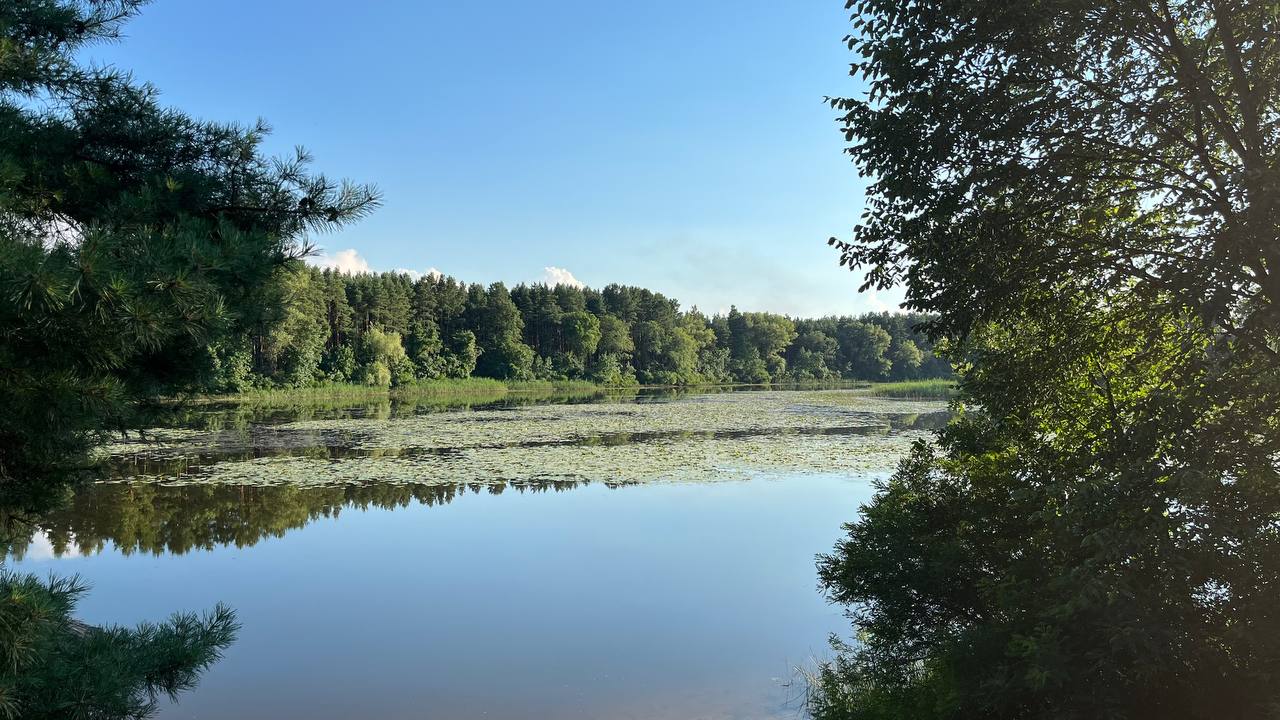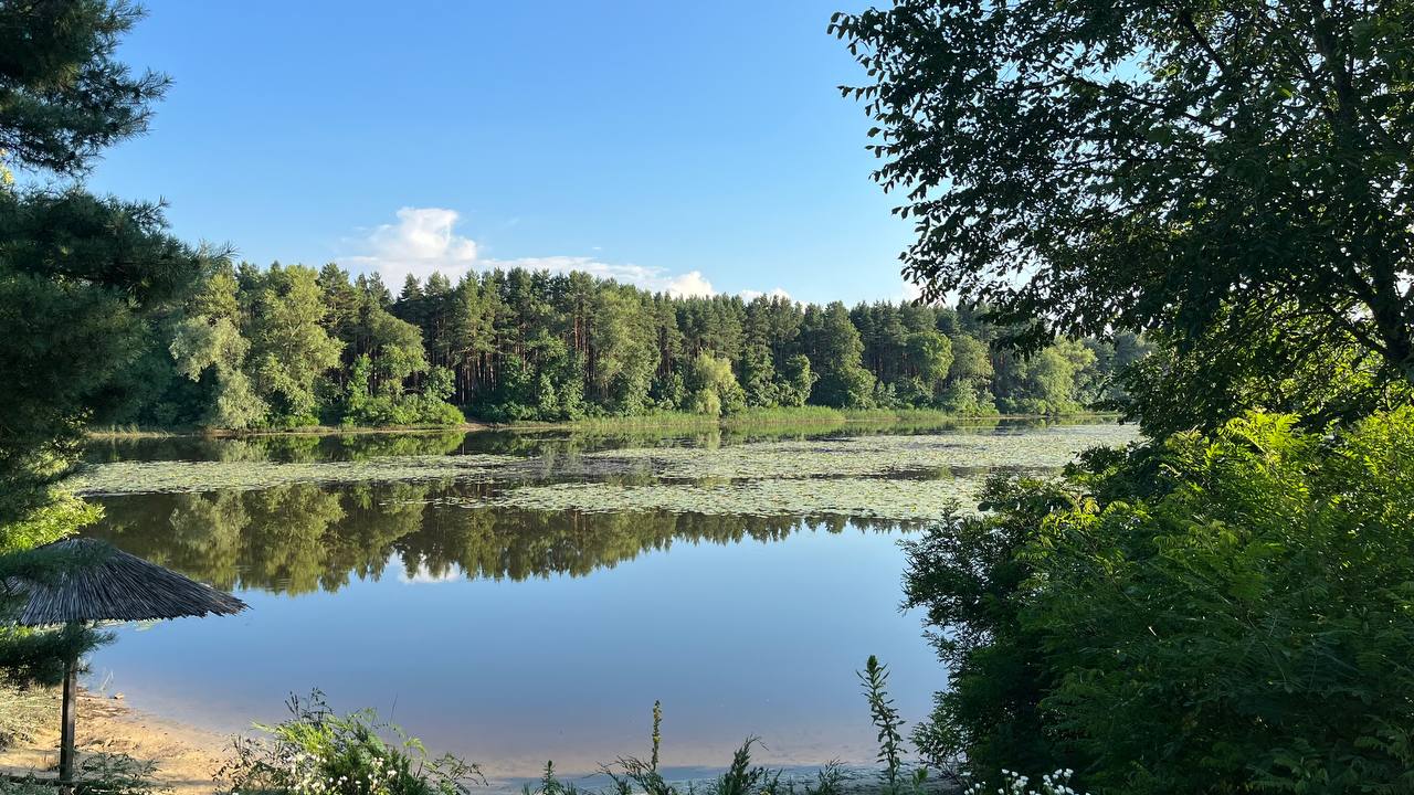 Пляж невеликий, оточений річковими ліліями. Вода чиста та тепла. Є зонт для затінку, але час тут для більшості явно не пляжний.